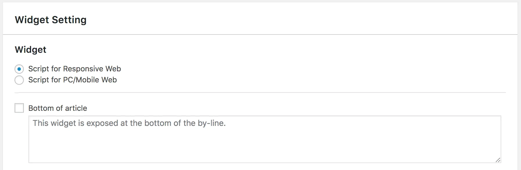 Please put the widget script you received via email in the box. You should check the box to enable that slot. (article bottom, left side of article, right side of article). ※ The result of “Left side of article”, ‘Right side of article” can be varied, depends on your theme. Please do a test before using it.